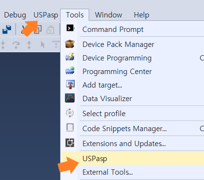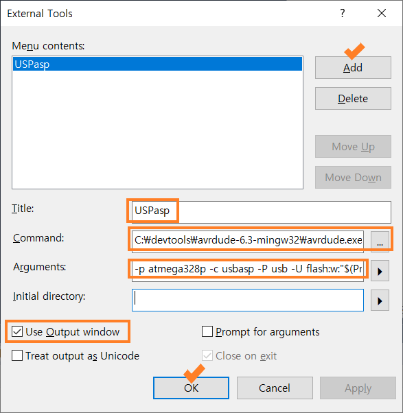 - External Tools에 추가하기 (Tools 메뉴에 USBasp 버튼 추가)