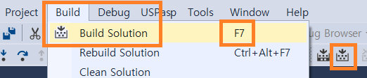 - 툴바에 있는 'USBasp'를 클릭하거나 'Tools->USBasp'를 클릭하여 빌드된 바이너리를 아두이노 보드로 다운로드한다.