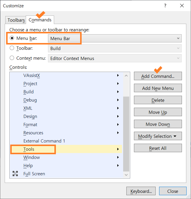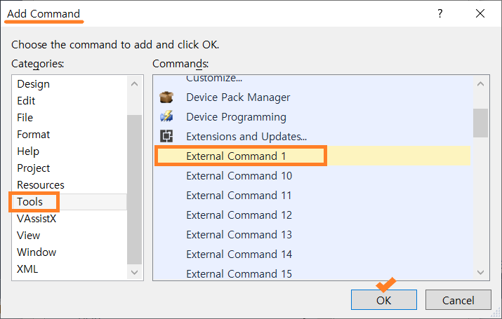 - 'Commands' tab → Menu Bar → Add Command → 'Tools' → 'External Command 1' → OK
