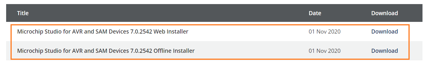 원래는 'Atmel Studio'였는데 최근에 이름이 'Microchip Studio'로 변경되었다. 이는 Atmel사가 Microchip Technology사의 소유가 되었고 결국 툴의 이름까지 변경한 것이다. 기존 사용자들에게 친숙한 이름이었을 텐데 굳이 바꿀 필요까지는 없었는데 말이다. 이 Microchip Studio를 설치해보자. 우선 여기에서 Web 혹은 Offline 설치 파일 중에 하나를 선택하여 다운로드하여 설치한다.