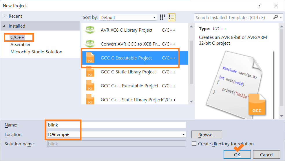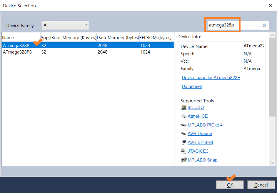 - 프로젝트가 생성되면 Device Selection 화면이 나타난다. 여기서 'atmega328p'를 검색하여 선택한 후 OK 버튼을 클릭한다.