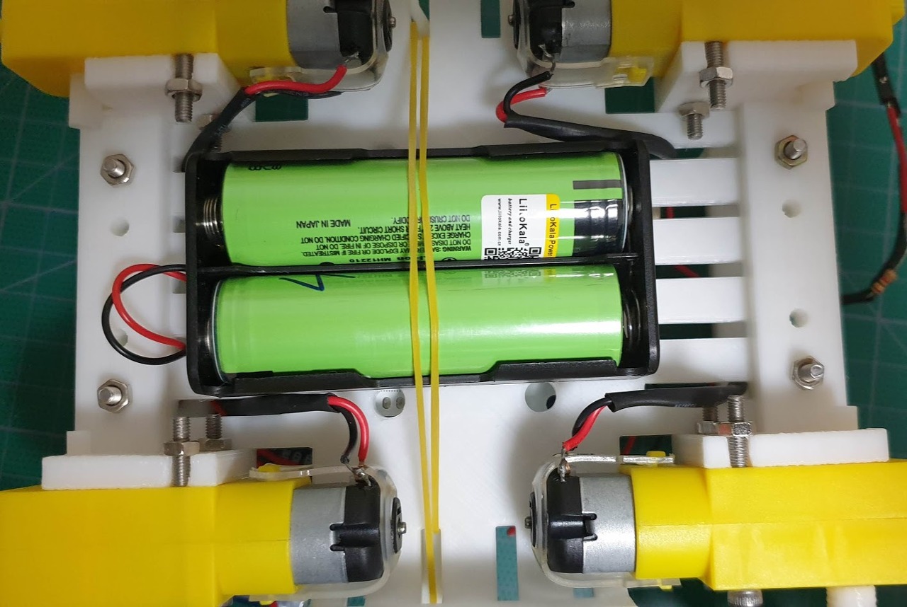 와이어링이 완료된 모습은 아래 그림과 같으며 배터리는 고무줄을 양쪽으로 걸어 몸체 하부에 안정적으로 장착하고 위쪽 덥게를 잘 장착하면 하드웨어가 완성된다.