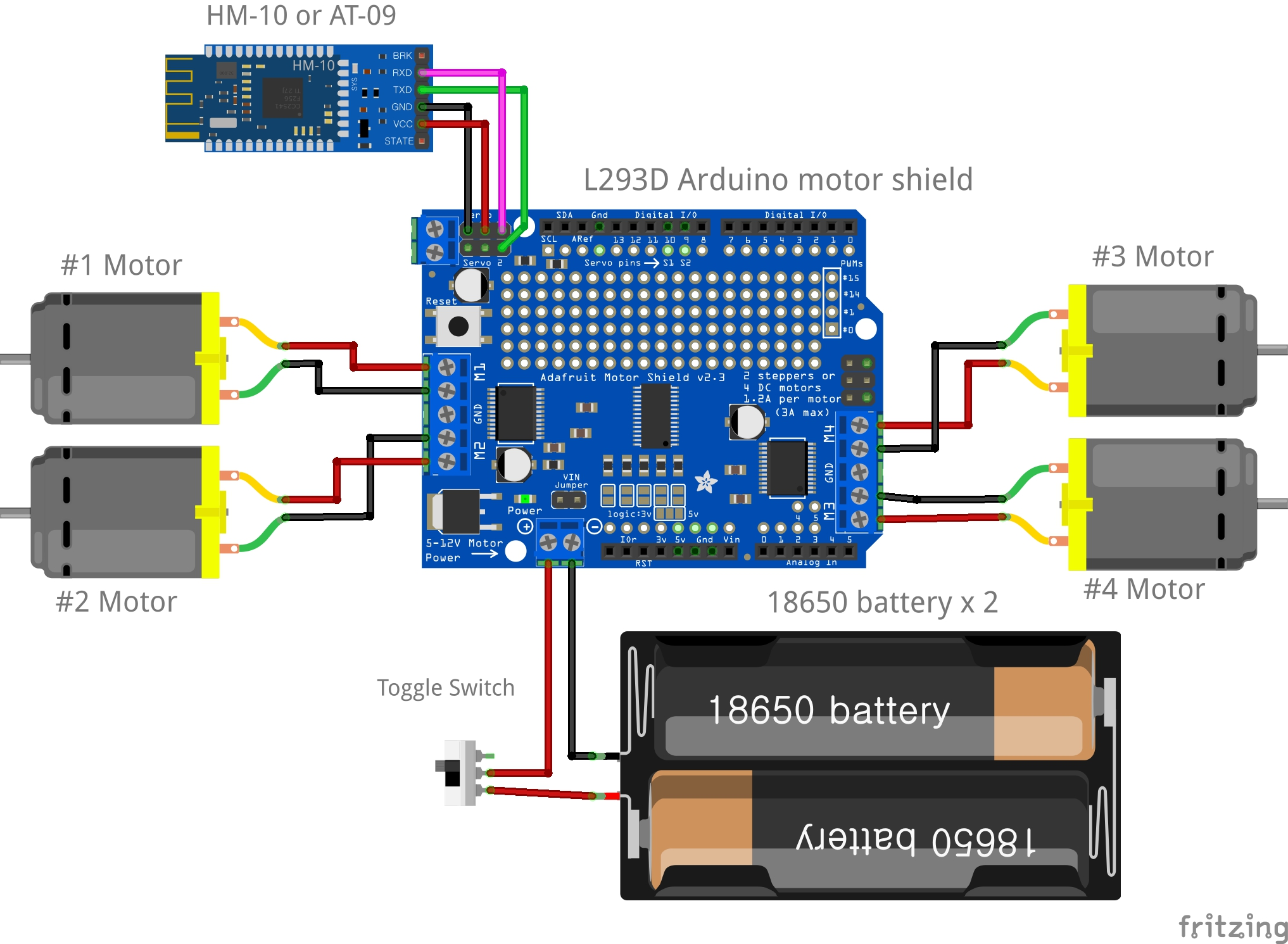 모터 실드를 아두이노 보드 위에 장착하고 주변 장치들은 이 실드 보드에 연결하면 된다. 우선 Mx_A와 Mx_B 단자에 TT 모터 4개를 방향에 주의하여 연결한다. 18650 배터리 2개는 On/Off를 위한 토글스위치와 함께 전원 단자에 연결한다. AT-09는 실드의 서보모터 연결 단자를 이용한다. 원래는 서보 모터를 위를 PWM 신호를 출력하지만 여기서는 Digital In/Out 기능으로 사용한다. AT-09의 RxD는 Servo1(아두이노:D10(PWM1B))에, TxD는 Servo2(아두이노:D9(PWM1A))에 연결한다.
