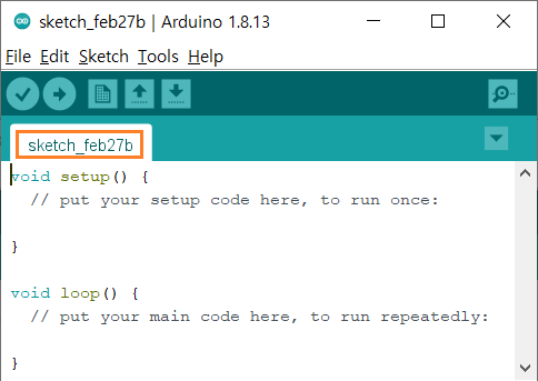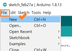 아두이노 IDE를 실행하면 비어있는 에디터가 아니라 마지막으로 사용한 Sketchbook이 열리면서 소스 파일들도 함께 열린다. 이 상태에서 새로운 Sketchbook 생성하기 위해서 File 메뉴에서 New를 선택(Ctrl+N)하여 새 에디터를 연다. 새 에디터가 열리면 이름이 sketch_xxxxxx 인 파일도 함께 생성된다. 처음 열렸던 에디터는 필요 없으니 닫아도 된다.