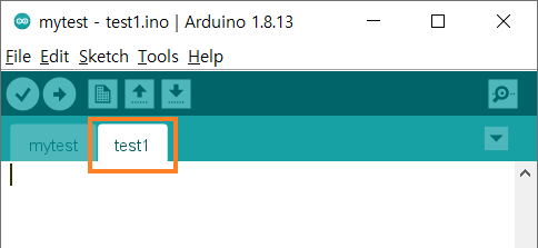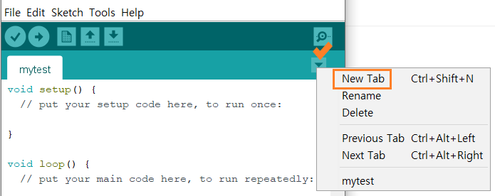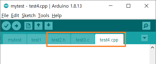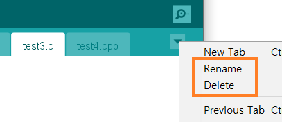 탭 우측의 드롭다운 메뉴(▼)에서 파일의 이름 변경 및 삭제도 가능하다. 탐색기에서 파일의 이름을 직접 변경하는 것도 가능하지만 IDE에 refresh 기능이 없어 IDE를 닫았다 다시 실행하면 변경된 파일 이름이 반영된다. 또한 새 소스파일을 탐색기에 바로 생성할 수 있는데 이때도 아두이노 IDE를 재실행해야 탭에 추가한 소스파일이 보인다.