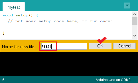Sketchbook을 만들기 위해 File 메뉴에서 Save를 선택(Ctrl+S) 한다. 그러면 'Save sketch folder as...' 창이 나타나며 기본으로 설정되어있는 폴더 위치가 나온다. 이 위치는 변경 가능하다. '파일 이름'에 원하는 이름을 적어 넣고 저장을 누르면 기입한 이름의 폴더가 기본위치에 생성되며 해당 폴더 내에는 같은 이름의 확장자가 .ino인 sketch 파일이 생성된다. 아래는 이름을 'mytest'로 했을 때의 예이다.