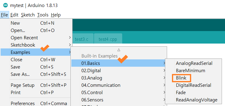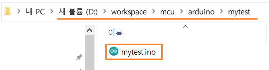 이 부분은 기존 sketch 작성과 똑같이 하면 된다. 먼저 mytest를 blink 예제를 참조하여 작성한다.