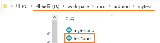 여기서 Ctrl+S로 파일 저장을 해보면 '§' 문양이 사라지면서 해당 폴더에 test1.ino가 생성된다. 앞에서 확장자를 따로 지정하지 않았지만 자동으로 확장자가 .ino인 아두이노 스케치 파일로 저장된다.