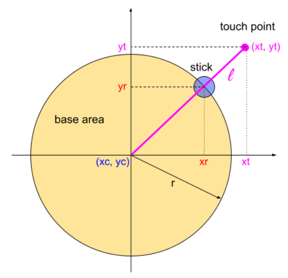 스틱이 위치할 좌표를 계산해보자. 터치 이벤트에 좌표 정보가 이미 포함되어있으므로 그 값을 그대로 사용하면 된다. 하지만 베이스의 바깥 영역을 터치하는 경우를 고려해야 한다. 이 영역에는 스틱이 도달할 수 없기 때문에, 터치 지점과 원점이 이루는 직선과 베이스의 가장자리 원주와 만나는 지점의 좌표를 구하여 거기에 스틱을 위치시키면 된다. 아래 그림을 통해 계산 식을 만들어보자.