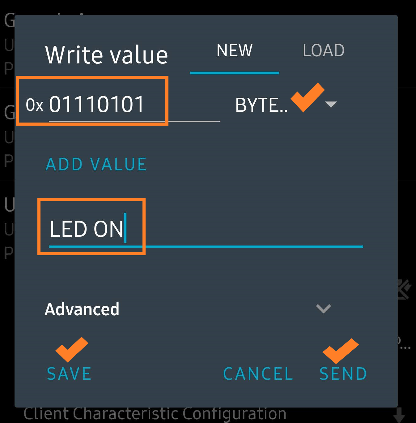 Characteristic의 '↥' 버튼을 클릭하면 'Write value' 창이 나타난다. 드롭다운 리스트에서 Data Type을 'BYTE ARRAY'로 지정한다. 예를 들어, LED를 ON 시키기 위해 '0x01110101'을 입력하고 'SEND' 버튼을 클릭하면 LED가 켜진다. 동일한 값을 나중에 다시 사용하고 싶다면 'SAVE' 버튼을 클릭하여 명령을 저장하면 된다.