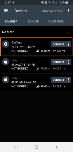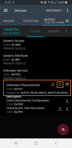테스트를 위해서는 HM-10과 연결하여 데이터를 주고받을 안드로이드 앱이 있어야 한다. 구글 플레이 스토어에서 nRF Connect for Mobile 앱을 설치한다. 이 앱은 블루투스 칩으로 유명한 '노르딕 세미컨덕터(Nordic Semiconductor)'에서 만든 앱으로 범용으로 사용할 수 있다. 앱을 실행시키면 자동으로 스캔을 시작한다. 앞에서 AT Command로 설정한 HM-10의 장치 명인 'BleTest'가 검색된 것을 볼 수 있다. 'CONNECT' 버튼을 클릭하면 HM-10의 BLE Service UUID로 설정한 '0xFFE0'가 하단에 보인다. 이 Service를 클릭하면 Characteristic UUID로 설정한 '0xFFE1'이 보인다.