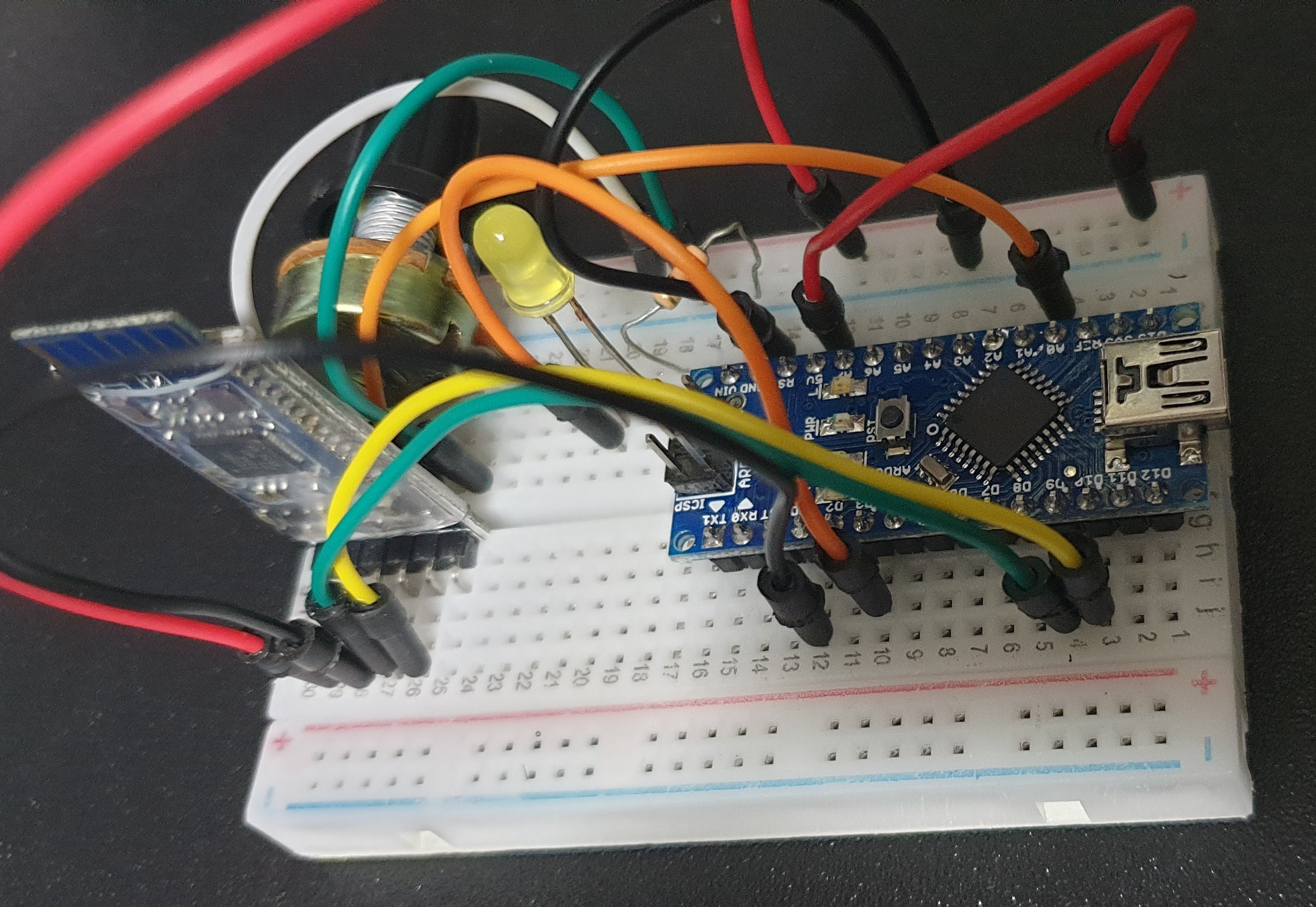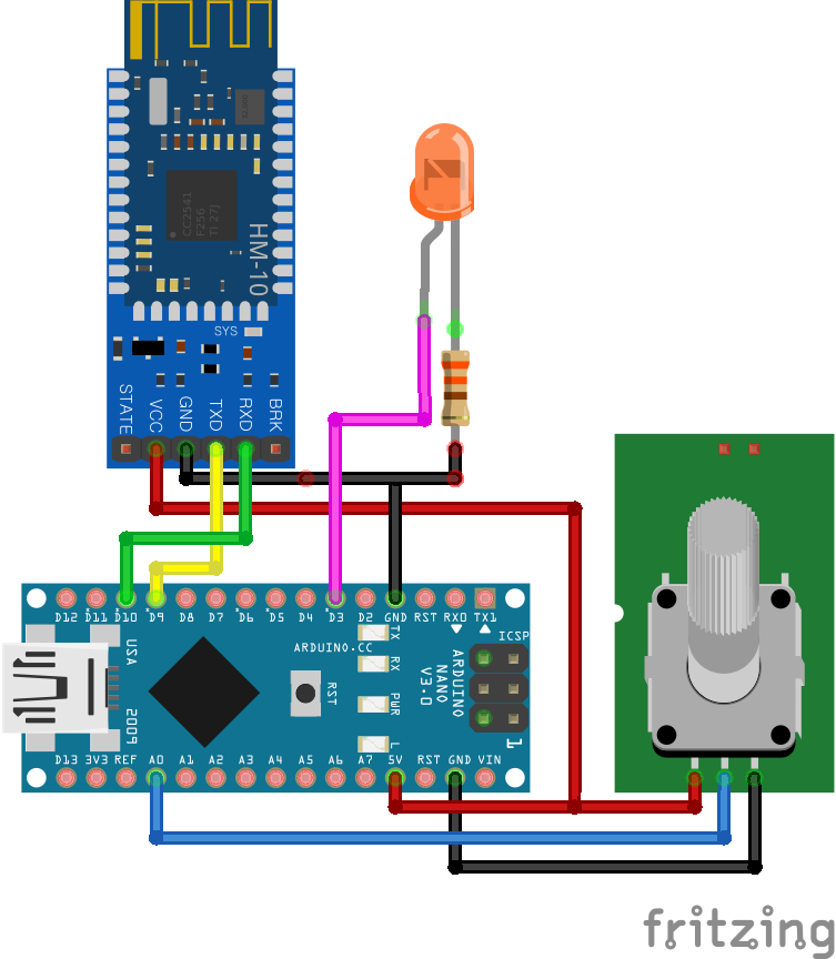 아두이노 나노를 중심에 두고 HM-10, LED, 가변저항을 연결한다.