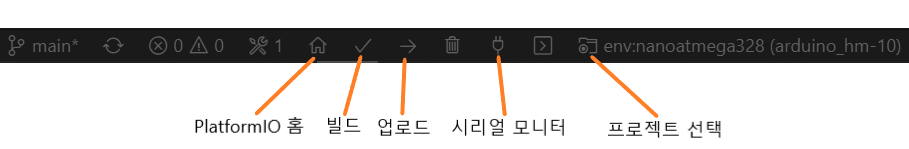 PlatformIO의 하단 툴바에는 개발에 필요한 버튼들을 제공한다.