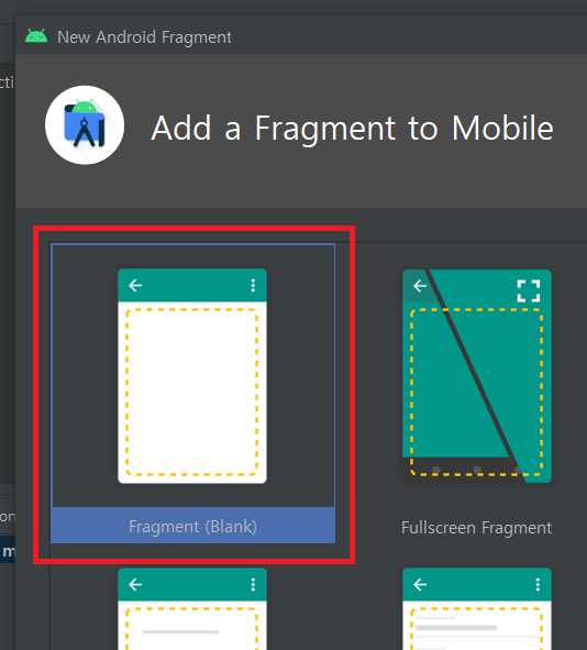④ New Android Fragment 창이 나타나면 Fragment (Blank)를 선택하고 Next 버튼을 클릭한다.