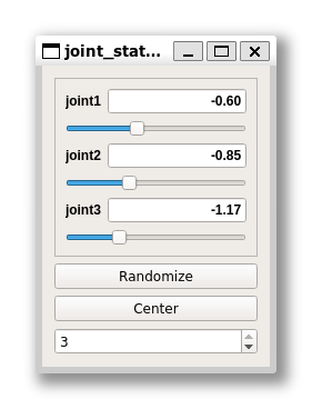 joint_state_publisher_gui 툴을 통해 조인트들을 조정할 수 있다. 이 툴에서 “Center” 버튼을 누르면 매니퓰레이터가 원래 위치로 돌아간다. 즉, 조인트 값들이 모두 0으로 조정된다.