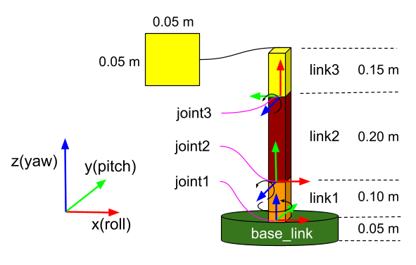 base_link는 5cm 높이로 설정하고 나머지 링크들은 순서대로 10cm, 20cm, 15cm로 설정한다. 그리고 각 링크 단면의 가로와 세로 길이는 모두 5cm로 설정한다.