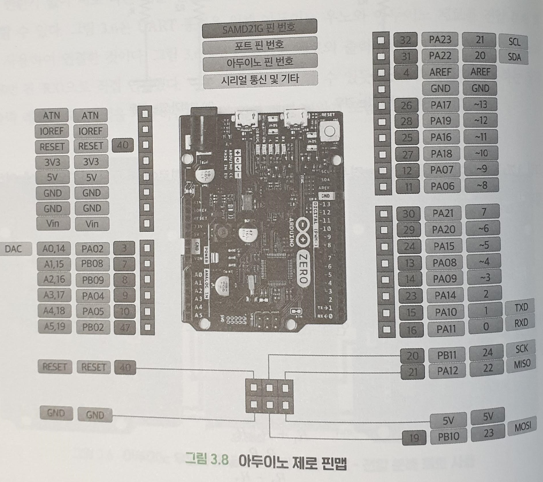 - 그림들이 흑백으로 되어있어 시인성이 떨어진다. 특히 책 소개에서는 핀맵이 컬러로 표현되어 있지만 책에는 아래 사진과 같이 흑백으로 되어있어 쉽게 구별이 되지 않는다. 그리고 그림에서 표현된 와이어링도 명확하지 않아 혼동을 줄 수 있다. 이 부분은 출판사 혹은 저자가 책에 사용된 그림들의 컬러 버전을 코드처럼 따로 제공하면 어떨까 하는 바람이다.